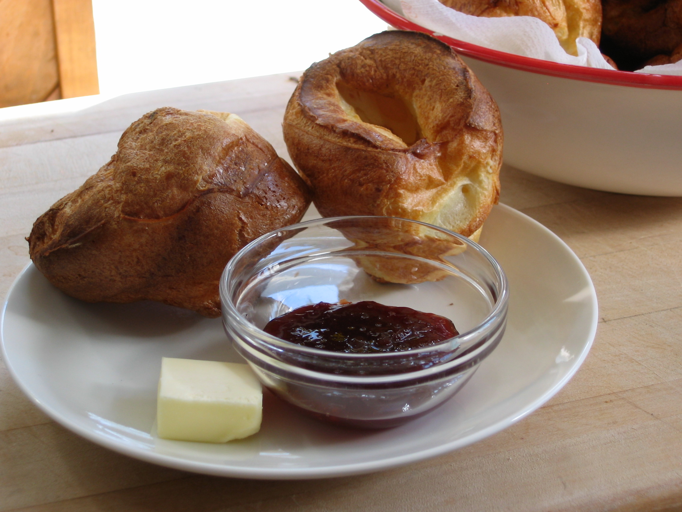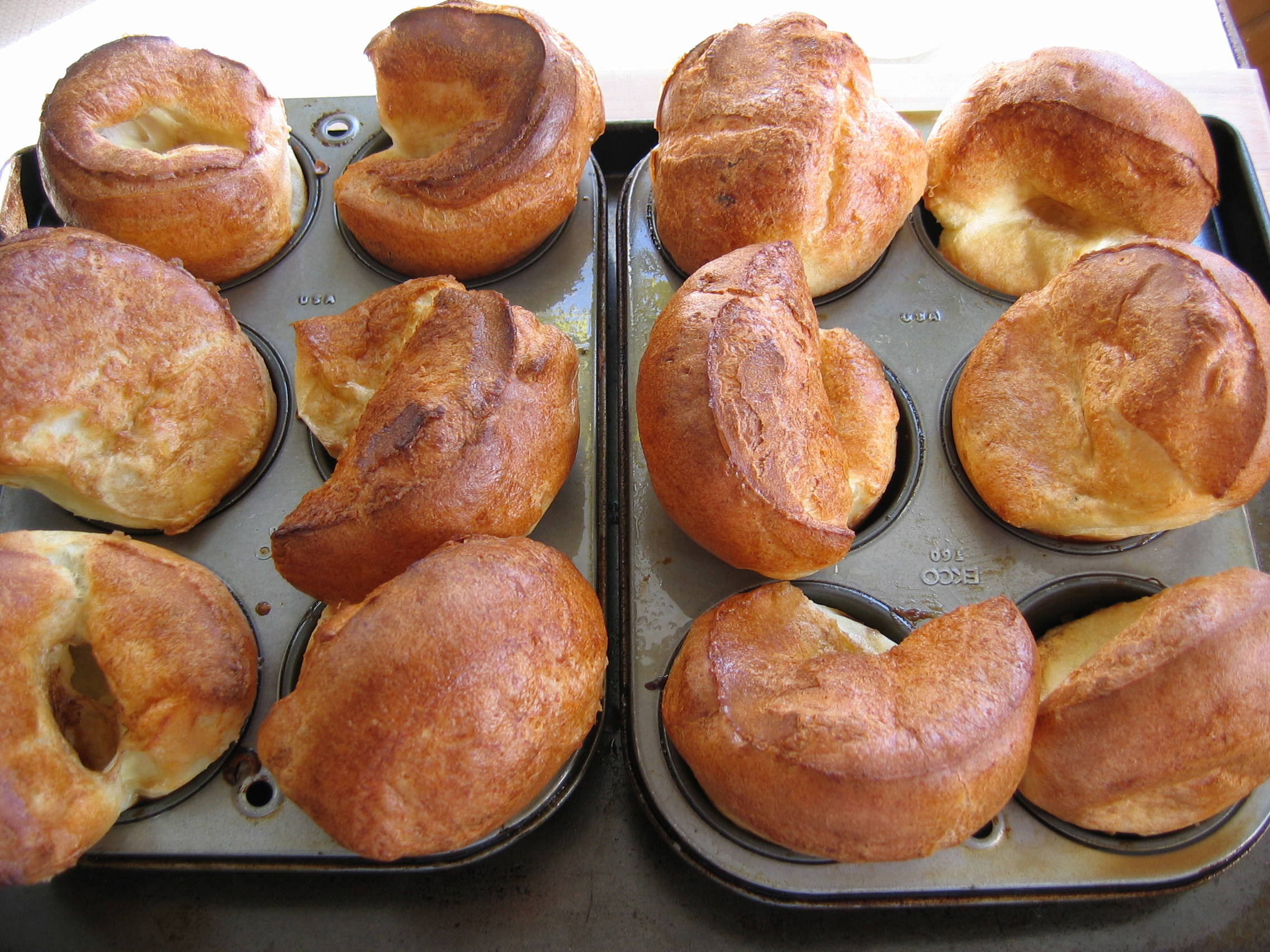 If I could, I think I’d eat popovers every day–there’s something about that eggy, custardy inside and the toothy, almost brittle outside that comforts me in a way very little else does. S had never tasted one before he met me, but he’s as devoted as I am now. Here’s the recipe I’ve been using lately, courtesy of The Barefoot Contessa Cookbook (yes, Ina Garten again–I promise I’ll lay off for a while after this!). One of these days I’ll get my mom’s recipe and compare.