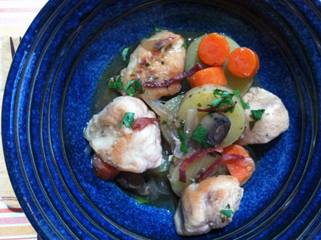 - Transfer the chicken to the onion bowl and add the remaining vegetables to the pot. Reduce heat to medium, and cook until the vegetables begin to soften, about 5 minutes. Add the sherry and scrape the bottom of the pan to remove all the delicious browned bits; simmer until most of the sherry has bubbled away. Return the chicken and onions to the pan, and add the broth and half the parsley. Bring to a boil then reduce heat to low and simmer, covered, for about 20 minutes, until the chicken and potatoes are cooked through.