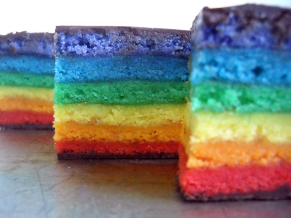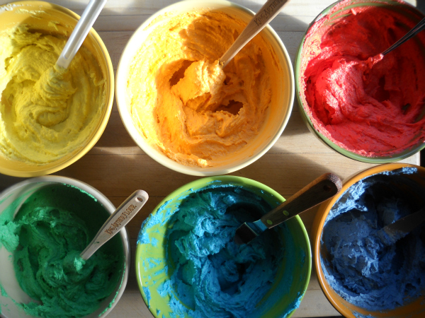 - While the first 2 colors are baking, spread the next pair into pans. While the second 2 are baking, spread the final pair. Allow cakes to sit in the pan for a minute or two, then invert onto wire racks; cool. The cakes will feel fairly delicate at first, but once completely cool they’ll be quite sturdy.