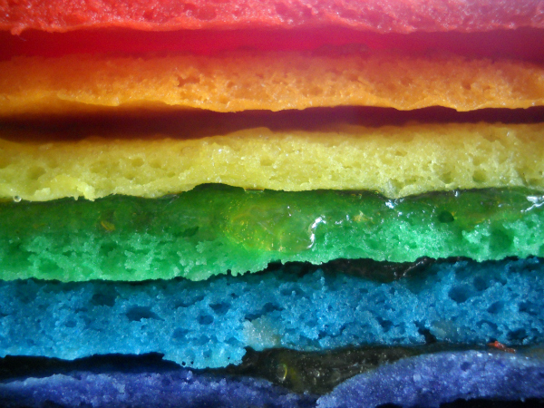 - Evenly divide batter into 6 bowls (I find it easiest to do this with a one-cup measure, putting one cup of batter into each bowl, then a second, etc). Add violet food coloring to one bowl, blue to the second bowl, and so on down the rainbow; stir colorings into batters. Using an offset spatula, spread the first 2 batters into a prepared baking pan. It will be a thin layer—don’t stress about making the edges and corners perfect, but do fill the pan. Bake those 2 pans until just beginning to brown, 8 to 10 minutes. If your oven bakes unevenly, rotate the pans halfway through.