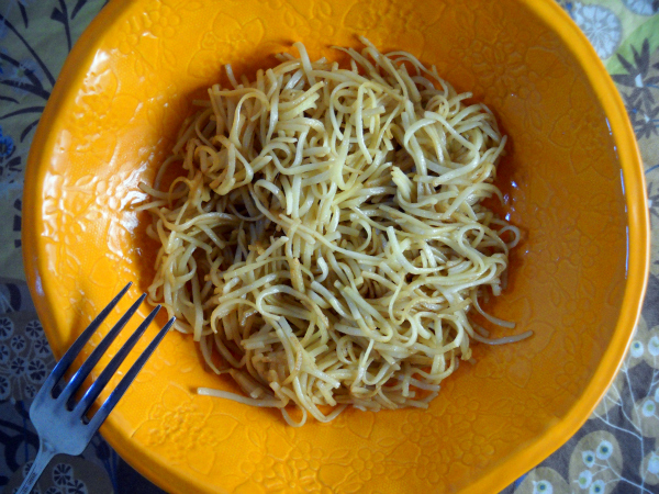 The next night I was feeling better, but not good enough for any kitchen wizardry (and not especially hungry—the best part of this getting-sick thing is that I lost four pounds). So Stephen fed Harry and, once the kid was in bed, made himself a sandwich. At which point I realized that huh, I actually was kinda hungry. Not for anything heavy, though, and nothing with too much going on. I looked at the abundant noodles and inspiration struck.