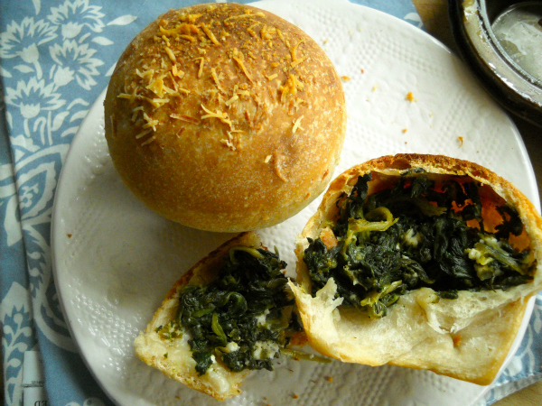 Lucky for me I have a toaster oven—at least I was able to finish baking the interrupted batch. Though they came out far from perfect-looking (the tops were too close to the heating element, so the sprinkled cheese practically carbonized), the taste was all there: spanakopita (aka Greek spinach pie), wrapped in pizza dough to make individual, hand-held servings. Since spanakopita can be served either hot or room temp, these are pretty fab for brown-bagging.