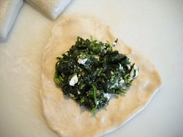 - Gently pull and stretch one piece of dough into a rough circle, approximately 4” in diameter. Don’t worry if it’s not perfect! Put a generous 2 tablespoons of filling in the center (go ahead and use more than you think you should—the spinach loses volume in the oven). Pull the edges of the dough up and over, pinching together in the center, until you have something kinda like a ball. Roll it gently between your hands to make it more spherical, then deposit into a muffin cup, seam-side down. Repeat with remaining dough and filling.