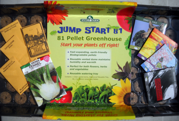 As I understand it, I’m supposed to moisten the little pods in the Jump Start seed starter thingy, and then plunk a couple seeds in each. Put the lid on, and let it sit a while. When the sprouts are a few inches high, transplant into my containers. Done.
