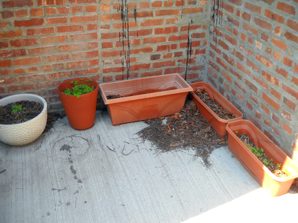 I wasted no time, once the workers left. First acquisition: a big ol’ Weber grill. Second acquisition: The planters you see below, bought second-hand from a botanist who was relocating to the west coast. Several of them have compost-rich, organic soil, and a few even have plants. I distinctly remember her telling me what she was growing in those containers, with instructions for how to get them through the winter. There was mint, and strawberries, and raspberries. I pictured myself plucking a juicy red berry, warm from the sun, and popping it into my mouth.