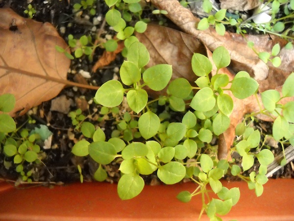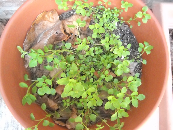 And then I did what I always do: I thought I’d remember stuff, ignoring the fact that since becoming a mother, my brain has taken on distinctly sieve-like attributes. I took notes on what she told me, but I neglected to mark which planter held which plant. So here we are, several weeks into what seems to be an early spring, and stuff is growing. I know, it’s exciting! But I can’t for the life of me tell what’s an actual plant and what’s a weed.