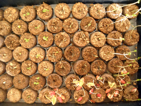 The rest of the tray isn’t doing quite as well. Things are happening, but much more slowly. My tomato seedlings are just starting to yawn open, and there’s no action at all on the fennel or marigold fronts.
