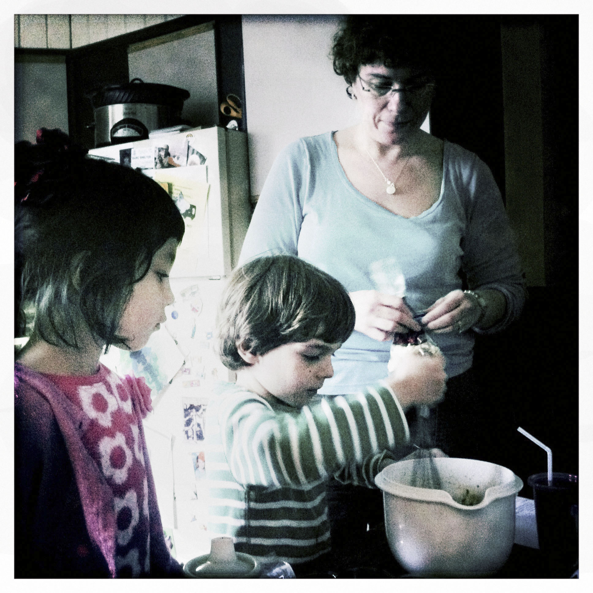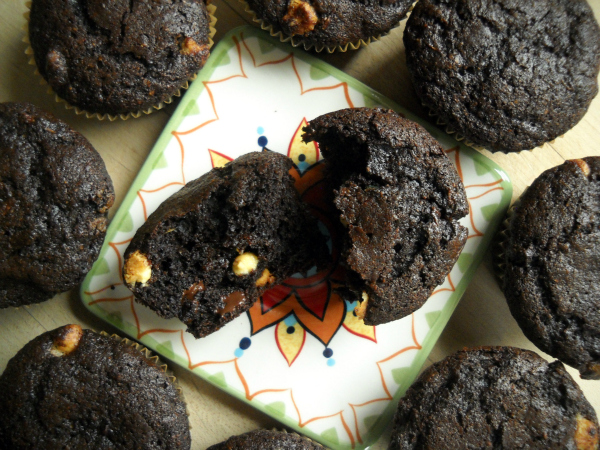 The beauty of these muffins is three-fold: First, they’re perfect for pint-sized helpers, since they’re stirred by hand. Second, they’re ideal after-school snacks, since the zucchini and whole-wheat flour adds just enough virtue to meet my comfort level. And third, thanks to Harry’s idea to use white and semi-sweet chocolate chips, they’re quite chocolaty without being over-the-top. Oh, and fourth, the recipe makes a nice big batch—enough for me to send some home with Harry’s sous chef and freeze a bunch more.