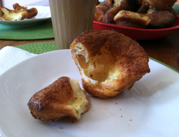 Take the crisp-outside/eggy-custardy-inside perfection that is a popover, and brush it with melted butter. Then sprinkle with cinnamon sugar—sparingly, if you’re like me and want the flavor without further addicting your already sugar-junkied child, or generously, if you’re only satisfying yourself. The end result is something like a cinnamon donut, only much, much, much better.