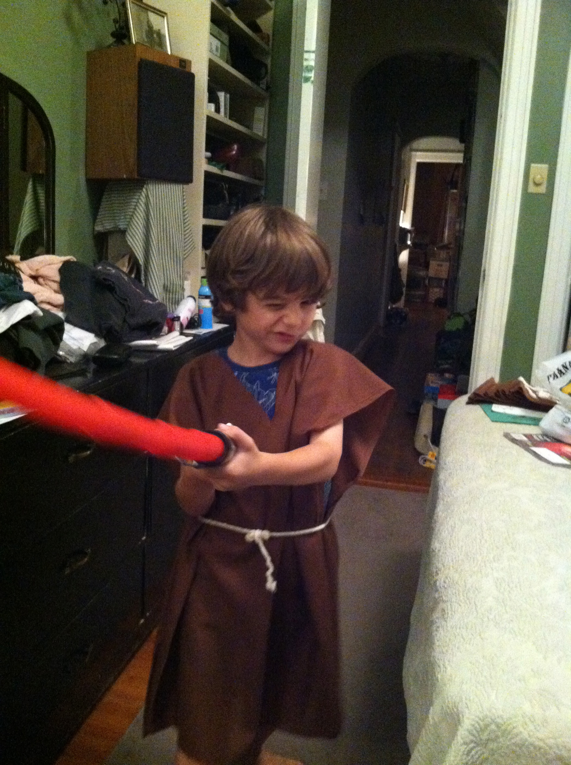 I made Jedi robes, people. He’s modeling a sample above. I don’t sew.