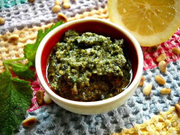 My darling husband isn’t generally a fan of pesto—he finds the basil overwhelming. As a result, over the years I’ve been forced to play with herbs and nuts, to find combinations he’ll actually eat. (There are five variations in the “Un-Recipes” chapter of my cookbook!) This one is so fresh and light-tasting, it brought a big ol’ smile to his face. Adding a bit of lemon juice to the mix really upped that flavor, while the herb itself is reminiscent of both the citrus fruit and—surprise—mint, an herbal cousin.