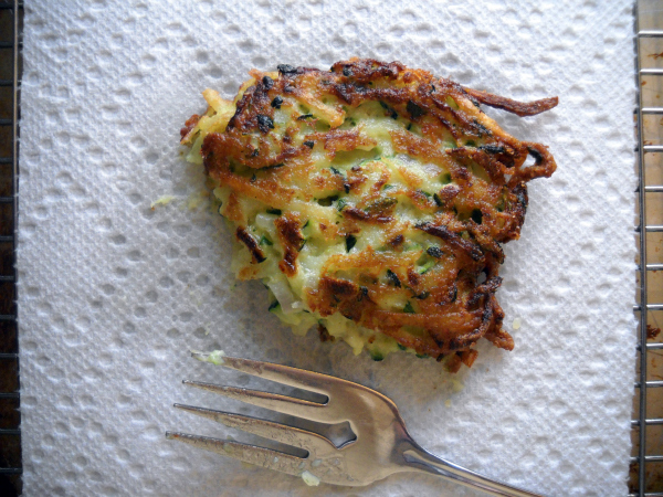 I use zucchini a lot. Like, a-lot-a-lot. But even I get tired of it sometimes, so I like to pair it with something that takes away from its zucchininess, just a bit. In this case, that’s potatoes. And feta. And Parmesan. Fried in just a bit of olive oil, you wind up with crispy little pancakes that are just cheesy enough for a light dinner (add soup or salad for a complete meal), and possibly even intriguing enough to please a picky eater.
