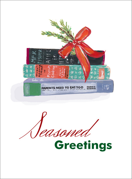 (Here’s where I blush and acknowledge the audacity of the illustration. I don’t mean to suggest that Parents Need to Eat Too is up there with the work of MFK Fisher and Julia Child. Not remotely. That image is an adaptation of an existing piece of art I found on Etsy, site of all things handmade and groovy. Nancy Nikko, the creator of this gorgeous work, made both the bookplates and the cards.)