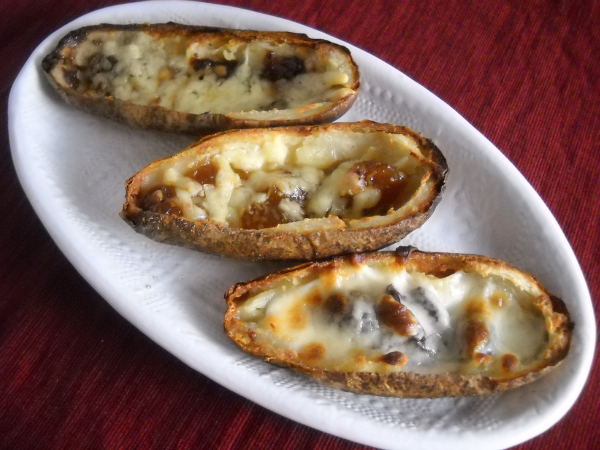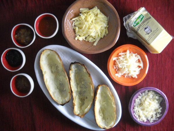 If that’s not possible (and I’m pretty sure it’s not), I’ll have to keep offering things like these potato skins. The idea here is similar to what I’ve explained before: You make the base item, in this case scooped-out baked potatoes, and present an array of toppings. Each person assembles his or her own creation, and after a quick run under the broiler, you feast.