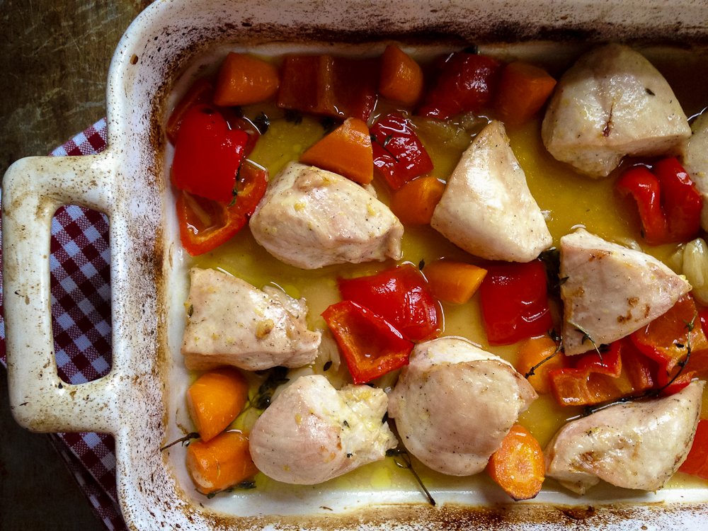 - Pour olive oil into a 13 x 9 baking dish and add the garlic, lemon zest, thyme, carrots, red pepper, optional potatoes, thyme, chicken breasts, and salt & pepper. Use your hands to toss well.