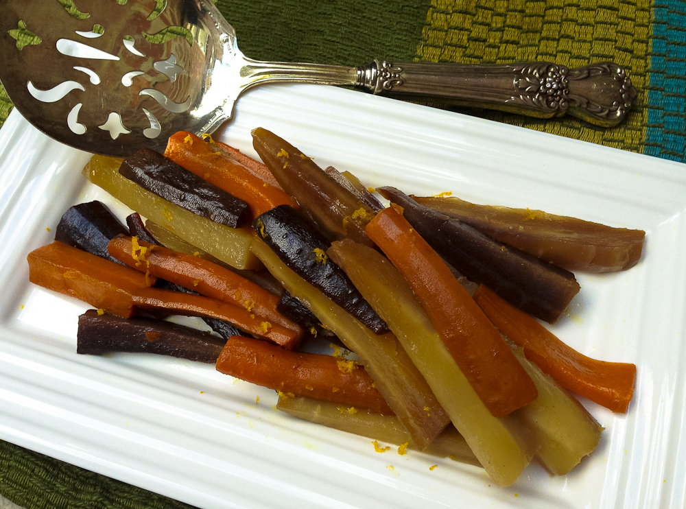 So this morning I peeled a giant mound of carrots—orange, purple, and white, from Saturday’s farmers’ market. Halved them crosswise, then cut them into batons. Tossed them in the slow cooker with equal amounts of olive oil and honey and a bit of salt, turned it on LOW, and went off to do our Very Important Things. When we came home almost nine hours later, the apartment smelled like Rosh Hashanah.